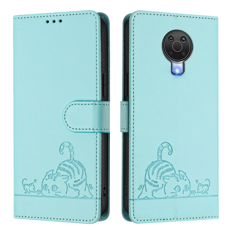 Funda de Cuero Rfid para Nokia G20/G10 con Relieve de Rata y Gato y Cordón (Verde Menta)