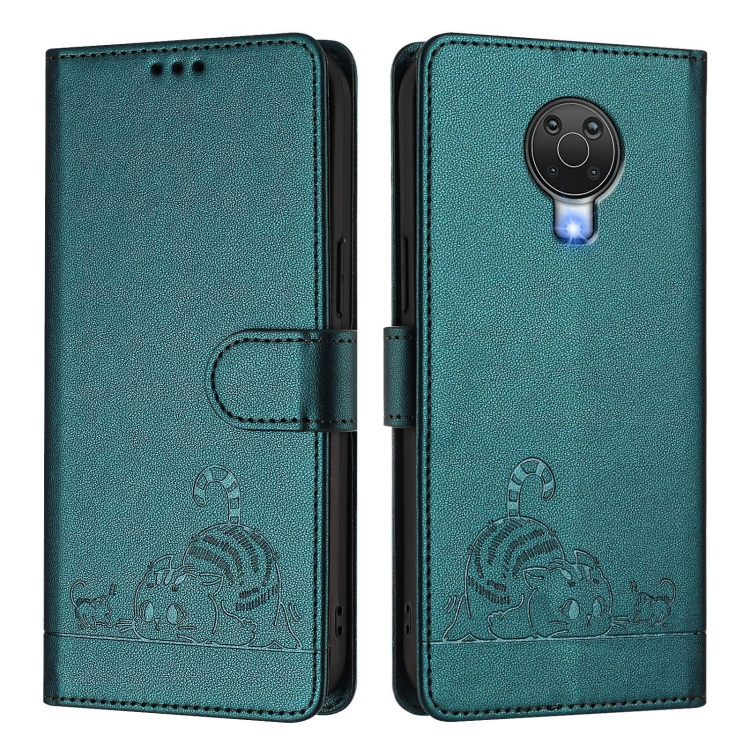 Funda de Cuero RFID con Relieve Rata y Gato para Nokia G20/G10 con Cordón (Verde Pavo Real)