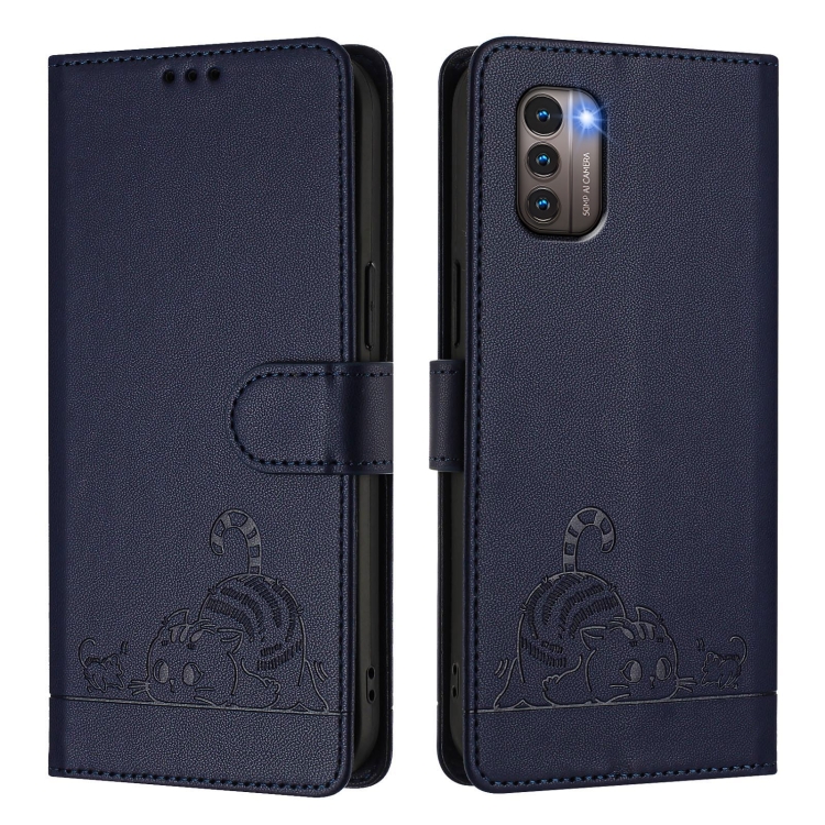 Funda de Cuero Rfid con Relieve de Rata y Gato para Nokia G21/G11 con Cordón (Azul)