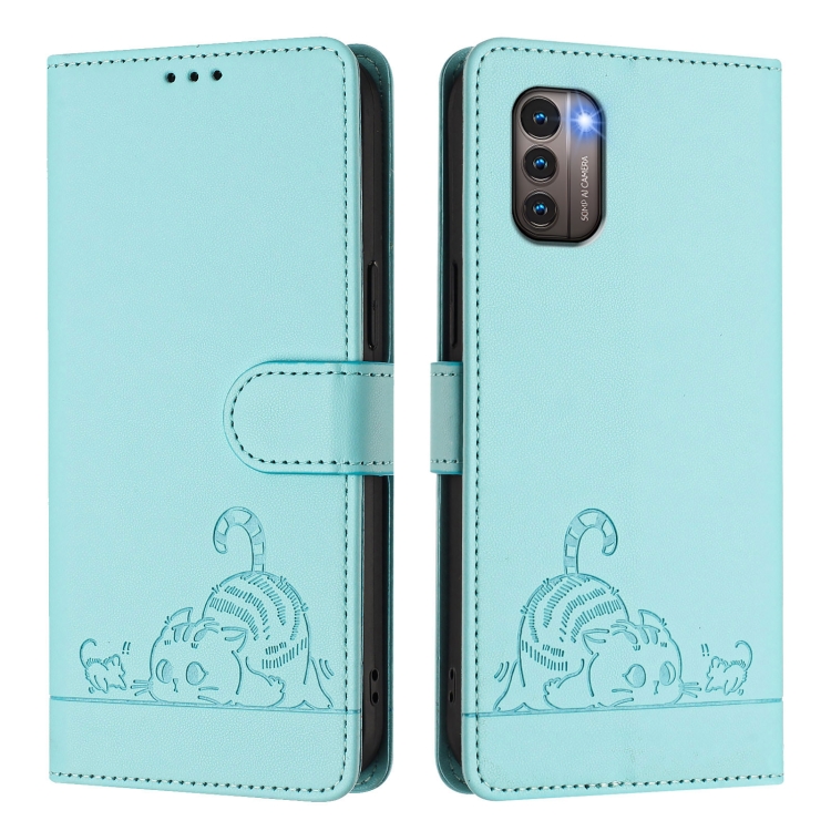 Funda de Cuero Rfid con Relieve de Rata y Gato para Nokia G21/G11 con Cordón (Verde Menta)