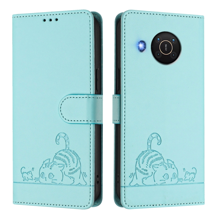 Funda de Cuero Rfid con Relieve de Rata y Gato para Nokia X20/X10 con Cordón (Verde Menta)