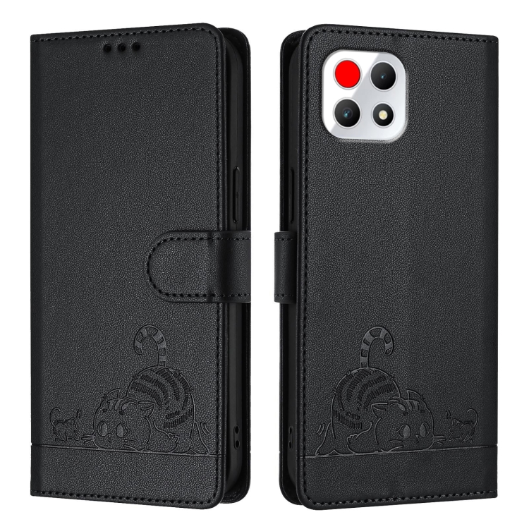 Funda de Cuero Rfid con Relieve de Rata y Gato para T-Mobile Revvl 7 5G con Cordón (Negro)