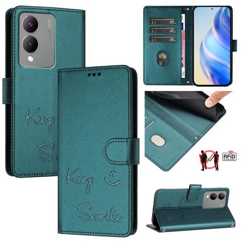 Funda de Cuero Rfid con Relieve de Sonrisa Global para Vivo Y17S 4G (Verde Pavo Real)