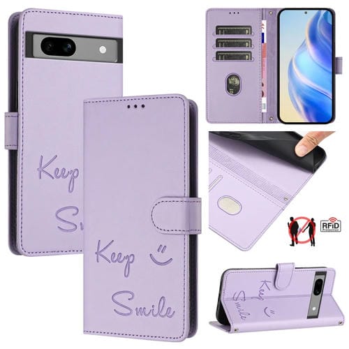Funda de Cuero Rfid con Relieve Sonriente para Google Pixel 7A (Morado Claro)