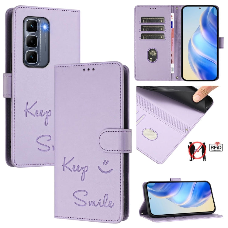 Funda de Cuero Rfid con Relieve Sonriente para Infinix Hot 50 Pro+ 4G (Morado Claro)