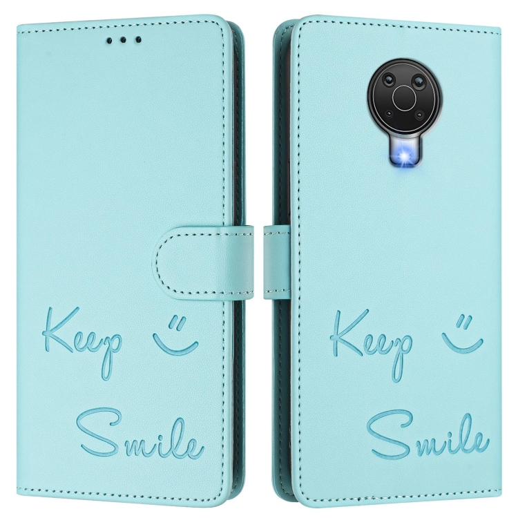 Funda de Cuero Rfid con Relieve Sonriente para Nokia 6.3/G20/G10 (Verde Menta)