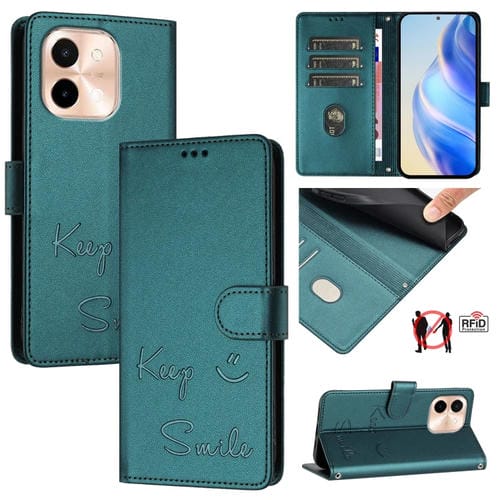 Funda de Cuero Rfid con Relieve Sonriente para Vivo Y28 4G (Verde Pavo Real)