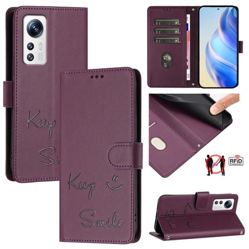 Funda de Cuero Rfid con Relieve Sonriente para Xiaomi 12/12X/12S (Violeta)