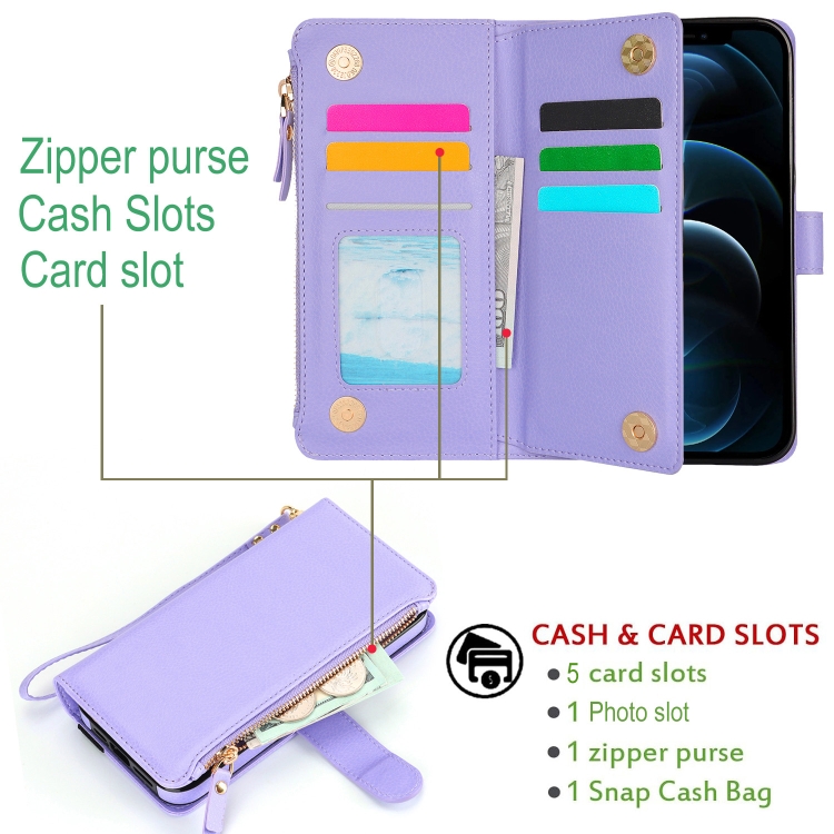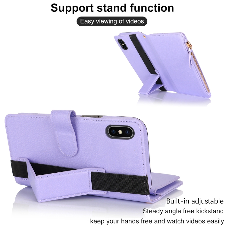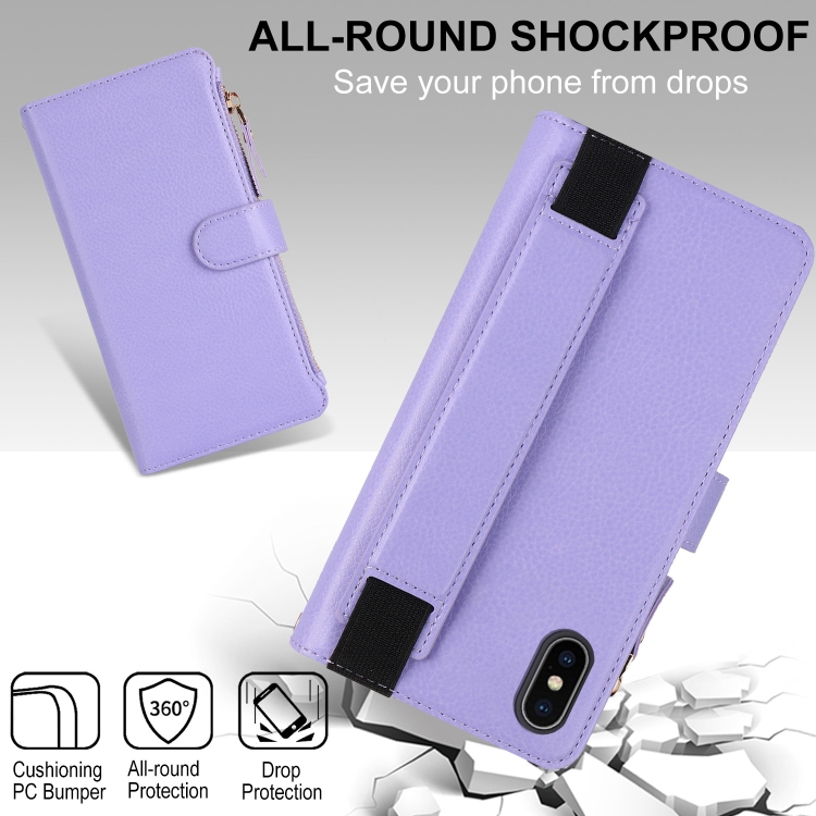 Funda de Cuero RFID para iPhone Xs/X con Cierre de Cremallera y Correa para la Muñeca (Morado)