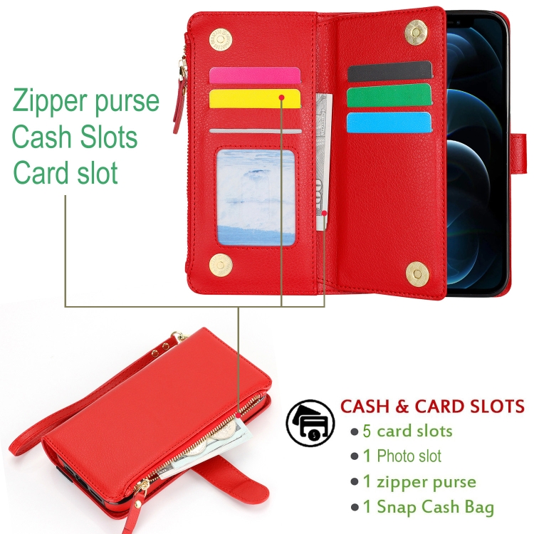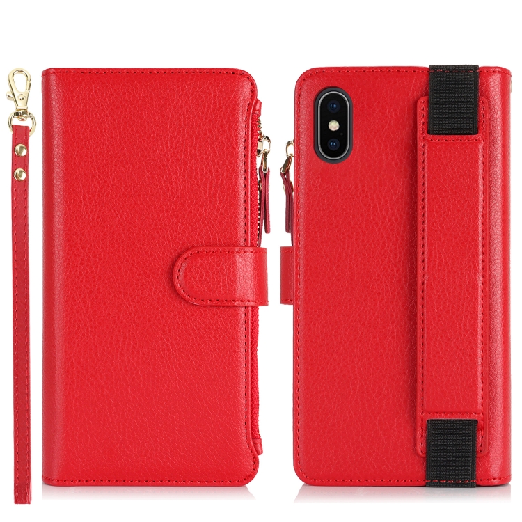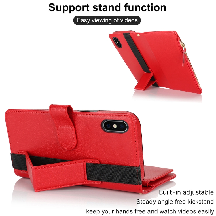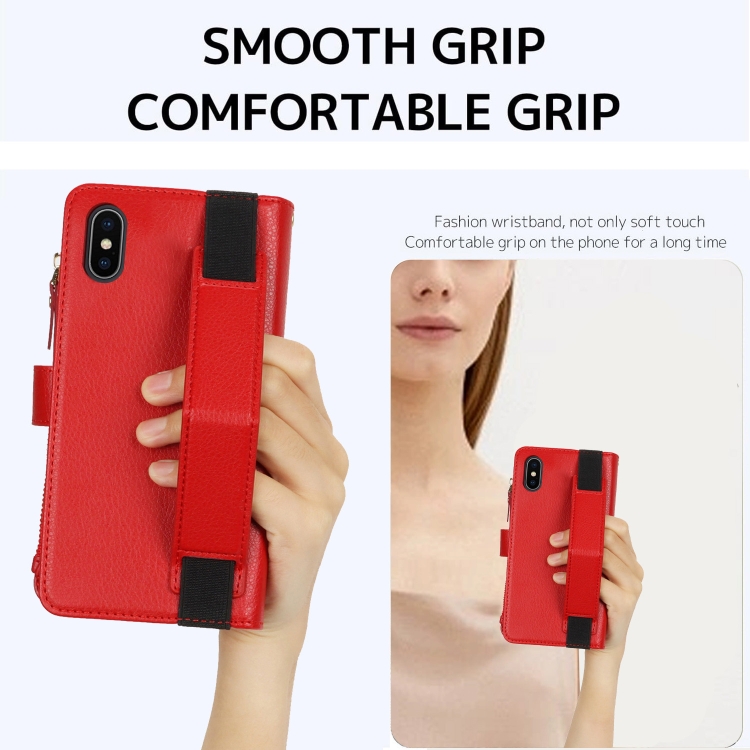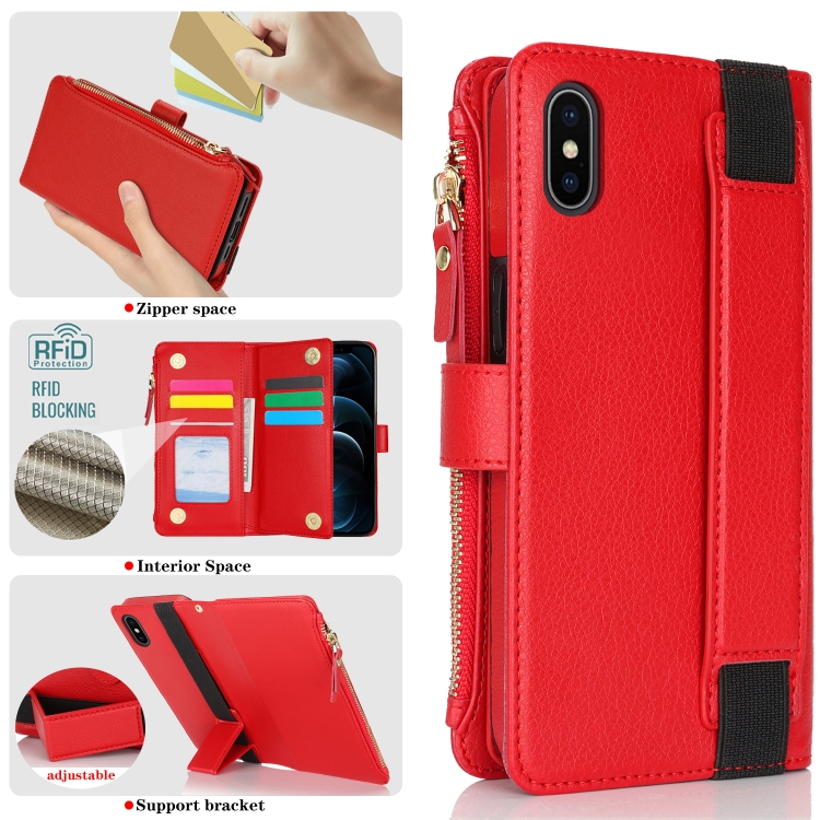 Funda de Cuero Rfid para iPhone Xs/X con Cierre de Cremallera y Correa para la Muñeca (Rojo)