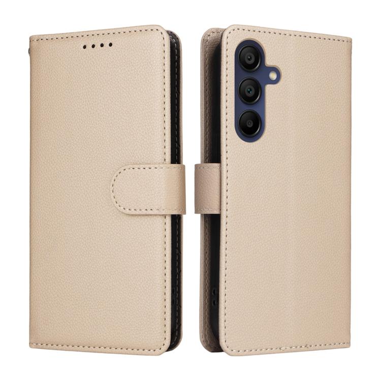 Funda de cuero tipo billetera con bloqueo RFID para Samsung Galaxy A15 4G/5G, textura Litchi, para 3 tarjetas (beige)
