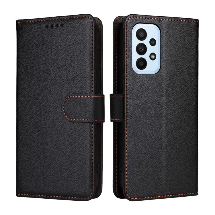 Funda de cuero tipo billetera con bloqueo RFID para Samsung Galaxy A23 4G/5G/F23 (textura Litchi, compatible con 3 tarjetas) (negro)