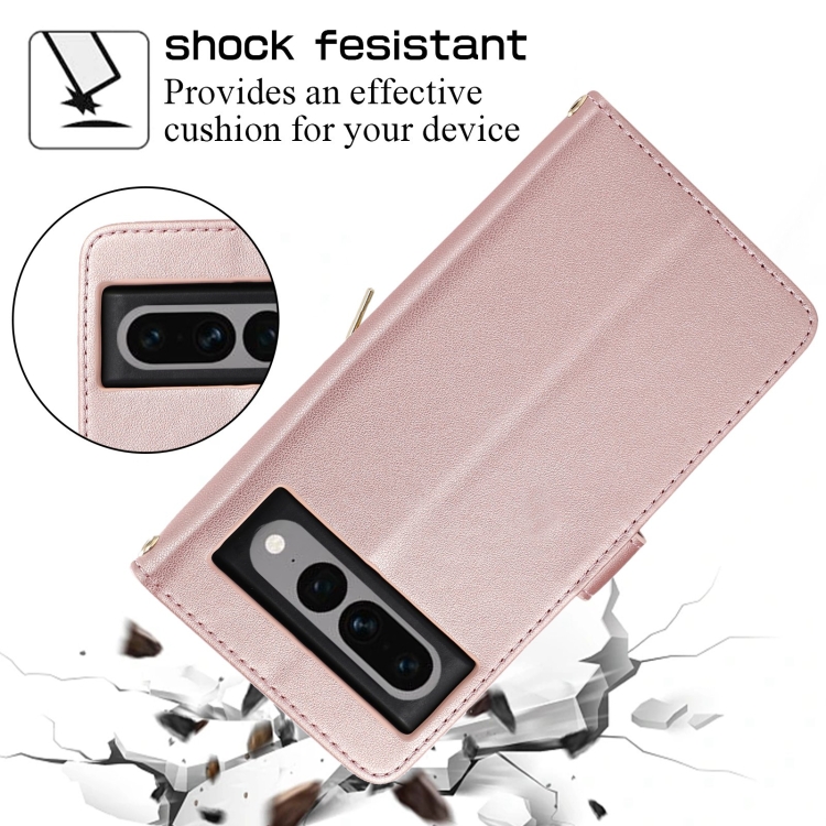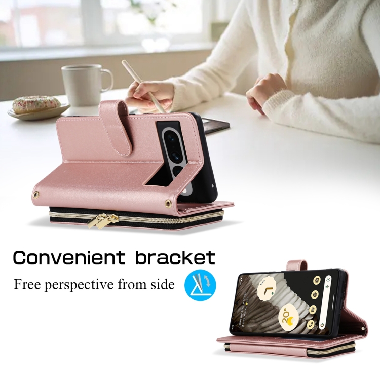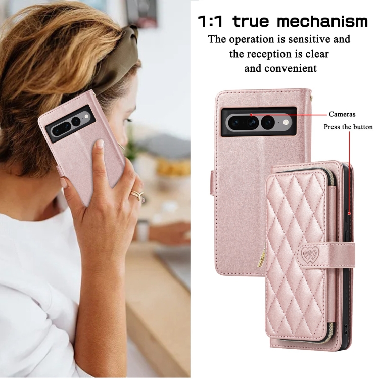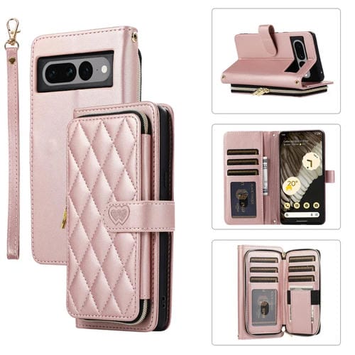 Funda de Cuero Tipo Billetera con Cremallera Completa y Diseño Rombal para Google Pixel 7 Pro (Oro Rosa)