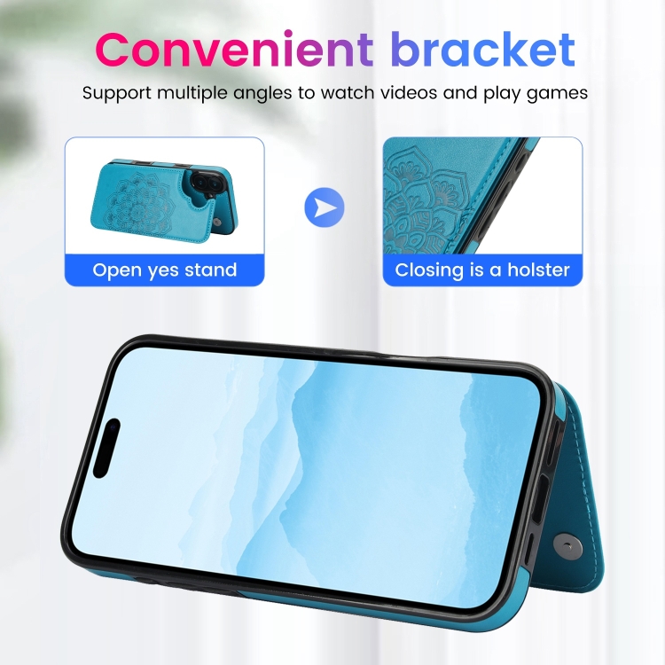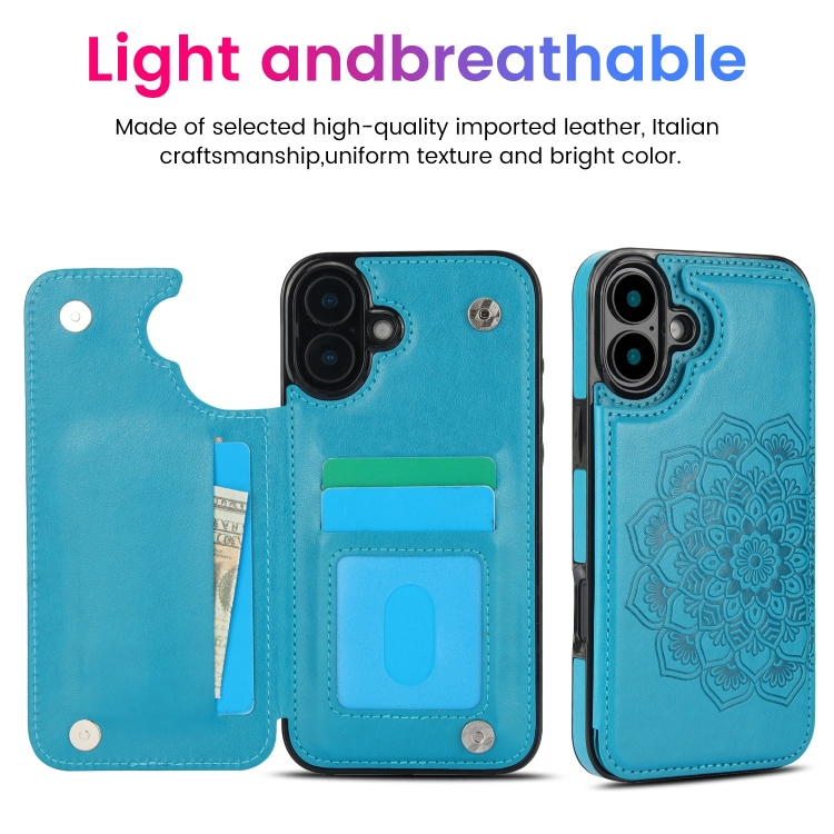 Funda de Cuero Tipo Billetera con Doble Hebilla y Diseño Mandala para iPhone 16 Plus (Azul)