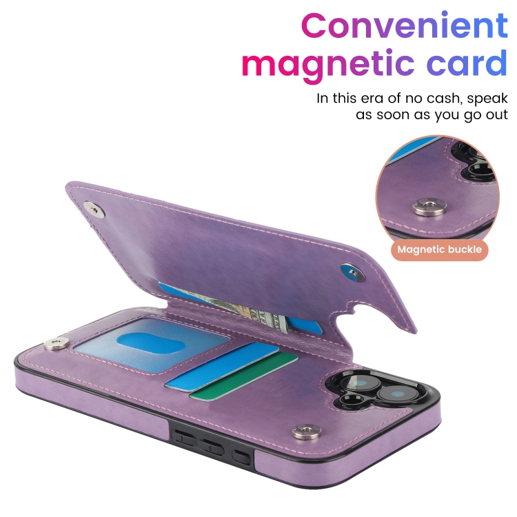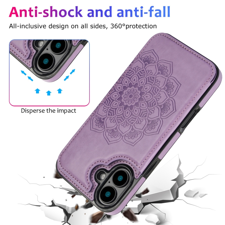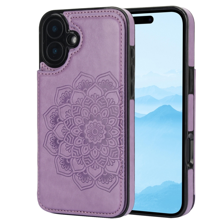 Funda de Cuero Tipo Billetera con Doble Hebilla y Diseño Mandala para iPhone 16 Plus (Morado)