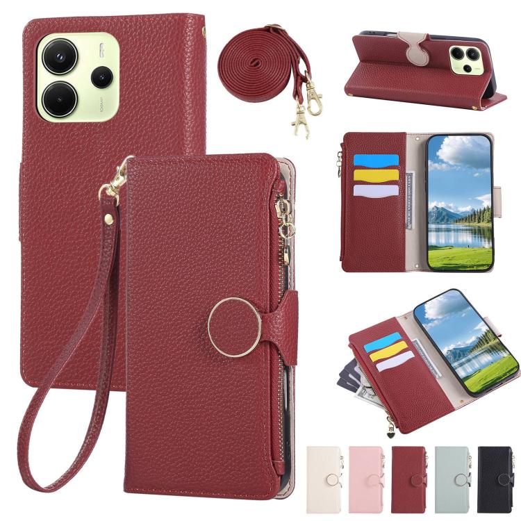 Funda de cuero tipo billetera con hebilla redonda y cremallera de 164,8 mm para Redmi Note 14 4G con correa cruzada (roja)