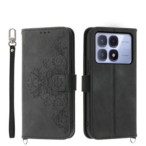 Funda de Cuero Tipo Billetera con Relieve de Flores y Tacto de Piel para Redmi K70 Ultra (Negra)