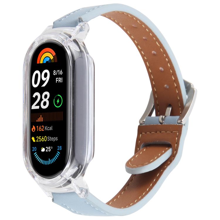Funda de PC para Xiaomi Smart Band 9 con correa de cuero de microfibra integrada (transparente y azul)