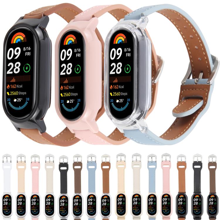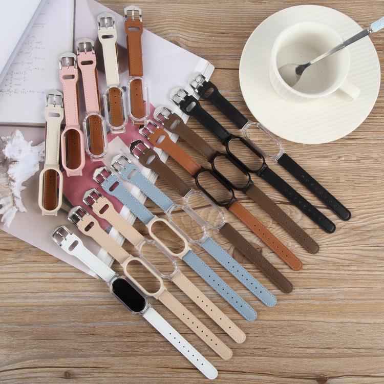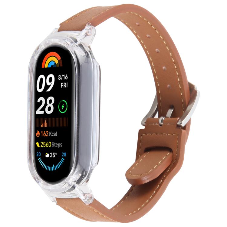 Funda de PC para Xiaomi Smart Band 9 con correa de cuero de microfibra integrada (transparente y marrón)