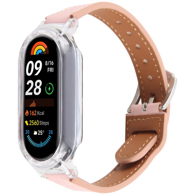 Funda de PC para Xiaomi Smart Band 9 con correa de cuero de microfibra integrada (transparente y rosa)