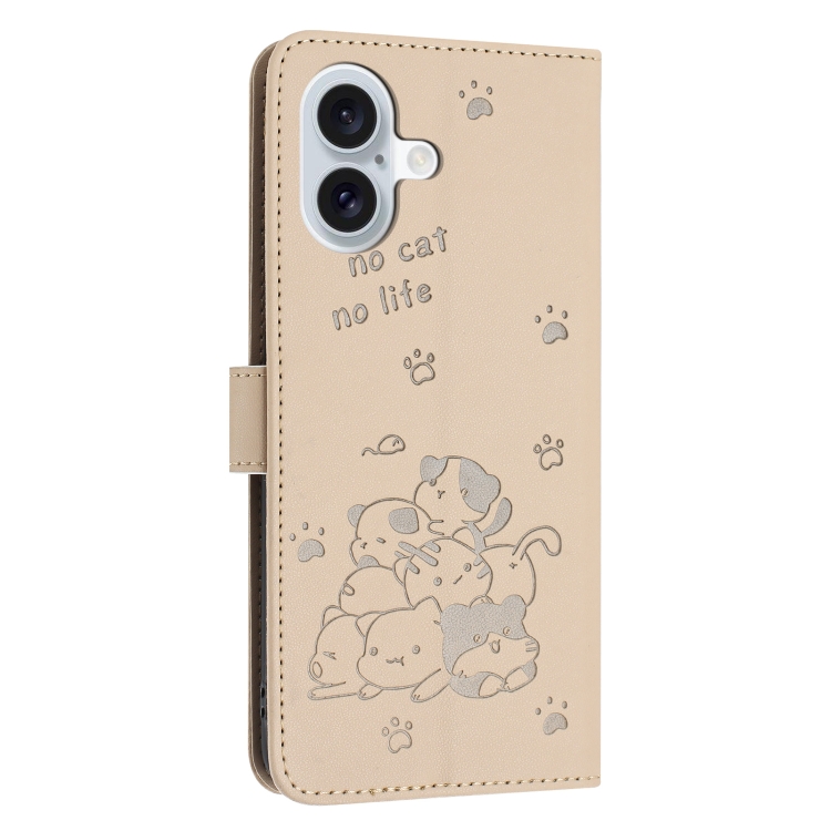 Funda de piel para iPhone 16 Plus diseño gatito en relieve con cordón (Beige)