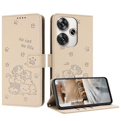Funda de Piel con Diseño de Gatito En Relieve y Cordón para Xiaomi Poco F6 (Beige)