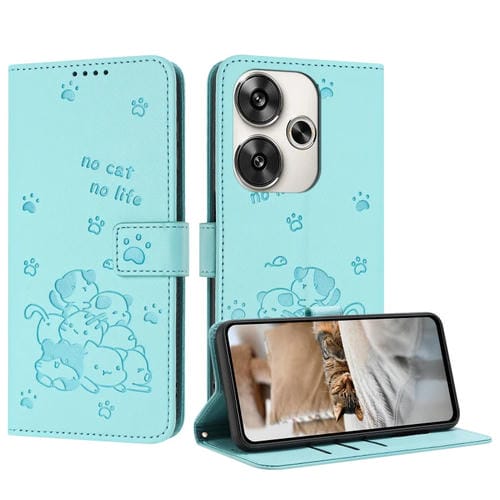 Funda de Piel con Diseño de Gatito En Relieve y Cordón para Xiaomi Poco F6 (Verde Menta)