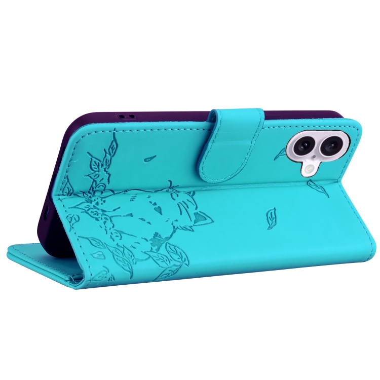 Funda de Piel para iPhone 16 Estampado de Gato (Azul Lago)