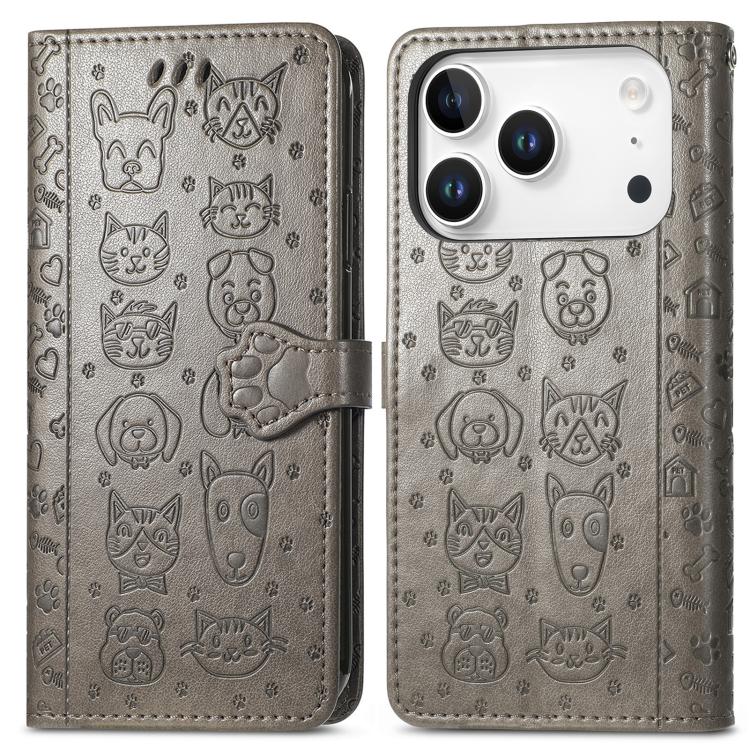 Funda de piel con estampado de gato y perro para iPhone 17 Pro Max (gris)
