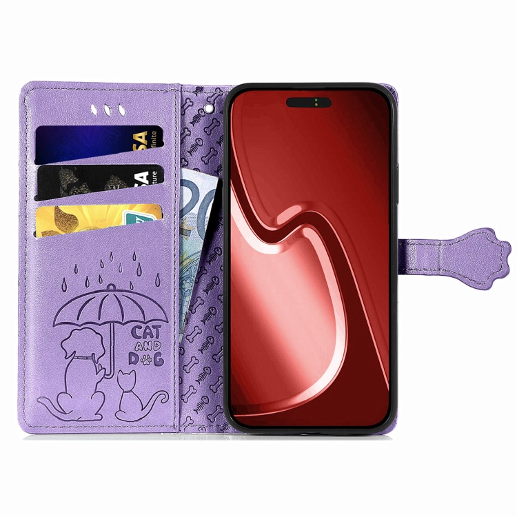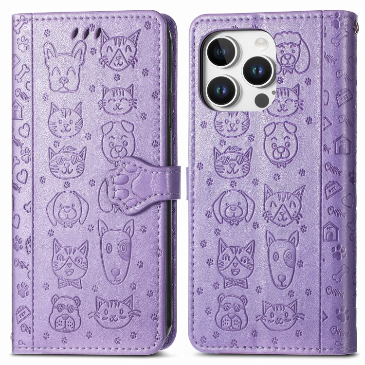 Funda de Piel con Relieve de Gato y Perro para iPhone 16 Pro (Morado)