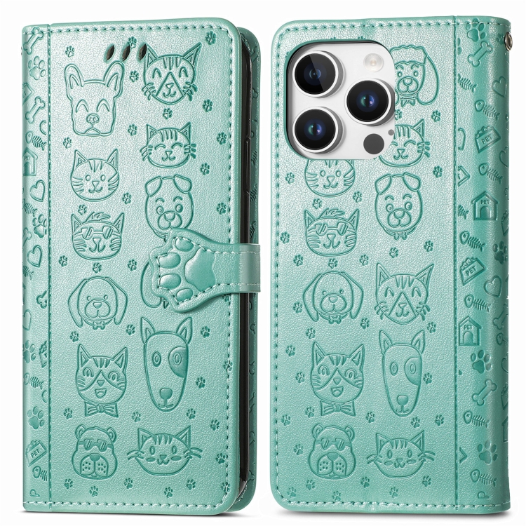 Funda de piel con relieve gato y perro para iPhone 16 Pro (Verde)