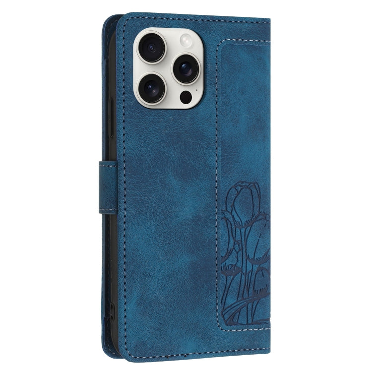 Funda de Piel con Relieve de Tulipanes para iPhone 16 Pro Max con Cordón (Azul)