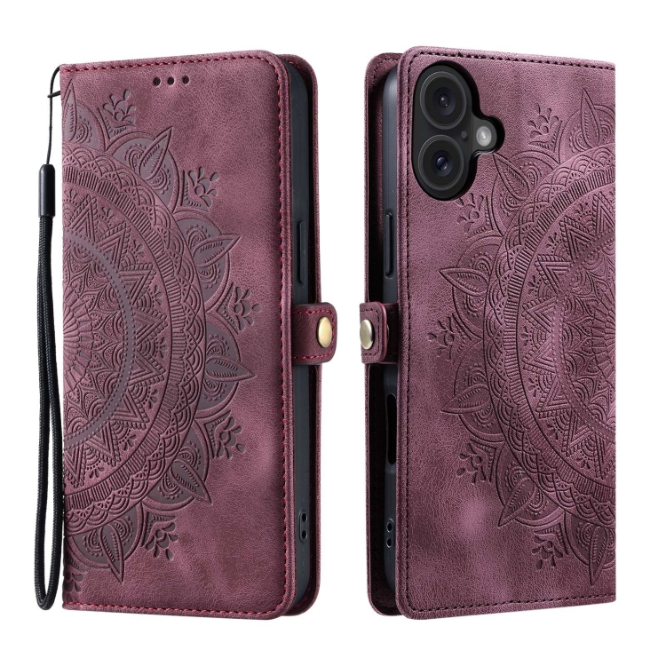 Funda de Piel con Relieve Totem para iPhone 16 Plus (Rojo Vino)