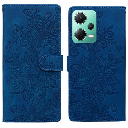 Funda de Teléfono con Hebilla Magnética y Encaje Floral En Relieve para Redmi Note 12 5G Global con Correa para la Muñeca (Azul)