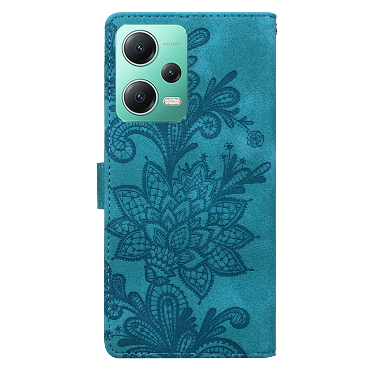 Funda de Teléfono con Hebilla Magnética y Encaje Floral En Relieve para Redmi Note 12 5G Global con Correa para la Muñeca (Verde)