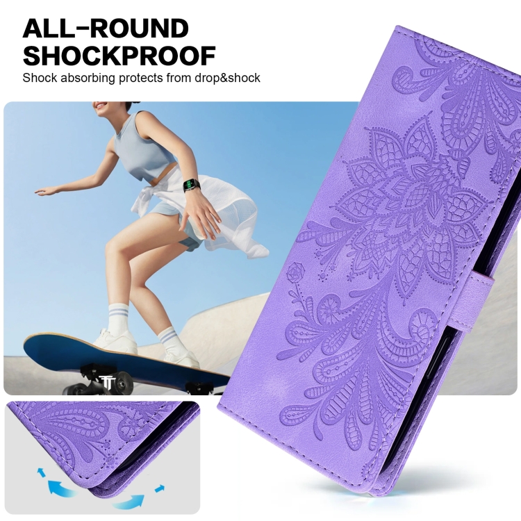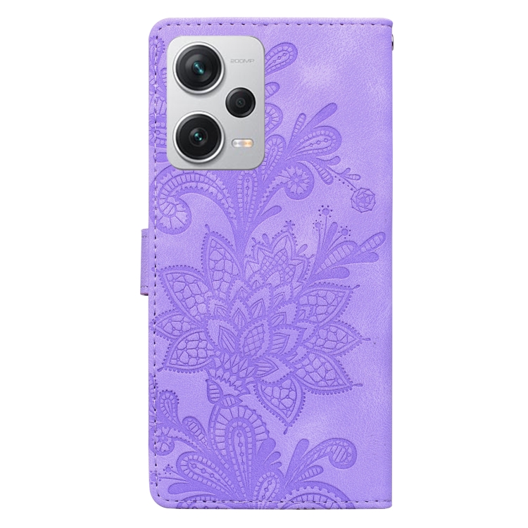 Funda de Teléfono con Hebilla Magnética y Encaje Floral En Relieve para Redmi Note 12 Pro+ 5G, con Correa para la Muñeca (Morado)