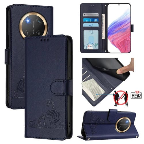 Funda Teléfono Honor X9C 5G Global Cuero Rfid con Cordón Patrón Gato y Rata (Azul)