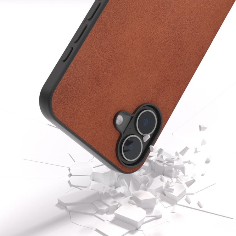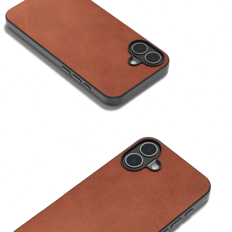 Funda de teléfono PU iPhone 16 textura becerro dos colores marco negro (Marrón)