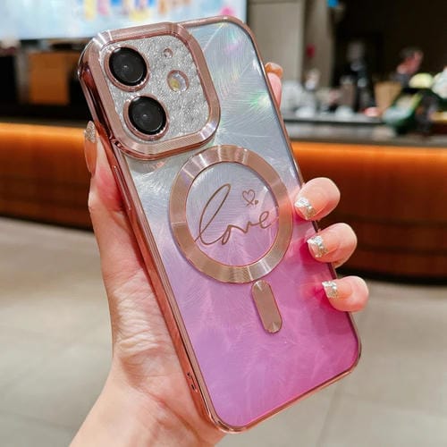 Funda de Teléfono TPU Dual-Love iPhone 12 Purpurina Degradado Plumas (Rosa)