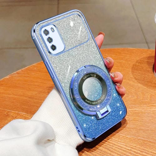 Funda de Teléfono de TPU con Soporte Redondo y Purpurina Degradada Plateada para Xiaomi Poco M3 (Azul Sierra)