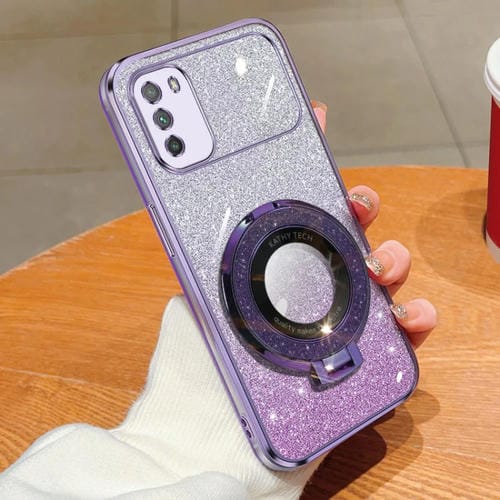 Funda de Teléfono de TPU con Soporte Redondo y Purpurina Degradada Plateada para Xiaomi Poco M3 (Morado)