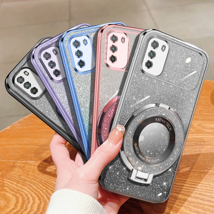 Funda de Teléfono de TPU con Soporte Redondo y Purpurina Degradada Plateada para Xiaomi Poco M3 (Negro)
