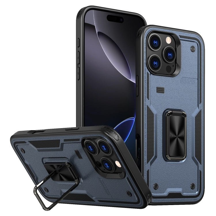 Funda híbrida TPU y PC para iPhone 16 Pro con soporte de anillo (Azul Marino)
