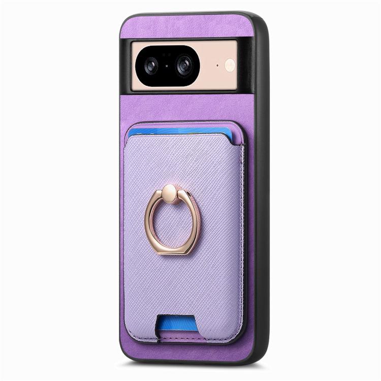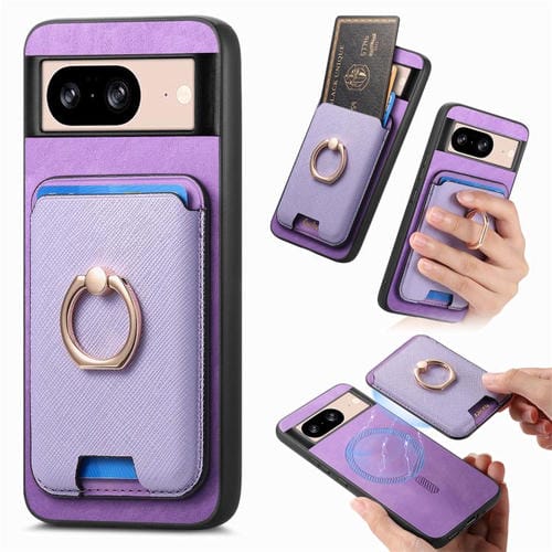 Funda para Google Pixel 8 con Ranuras para Tarjetas y Anillo de Cuero Diseño Retro (Morado)