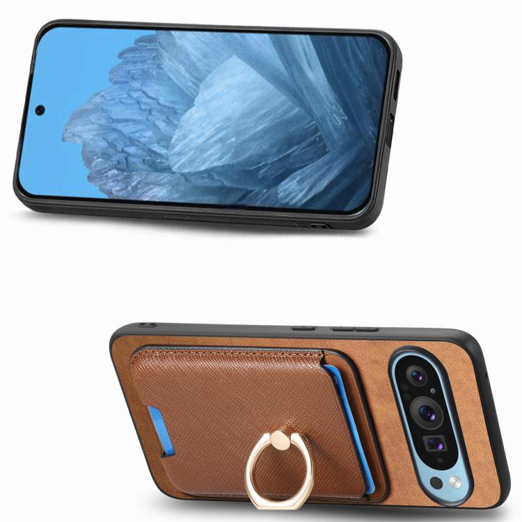 Funda para Google Pixel 9 y 9 Pro con Anillo de Cuero Retro, Ranuras para Tarjetas, Inserción Vertical y Magsafe (Marrón)