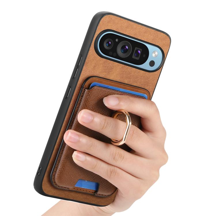Funda para Google Pixel 9 Pro XL con Ranuras para Tarjetas y Anillo de Cuero (Marrón)