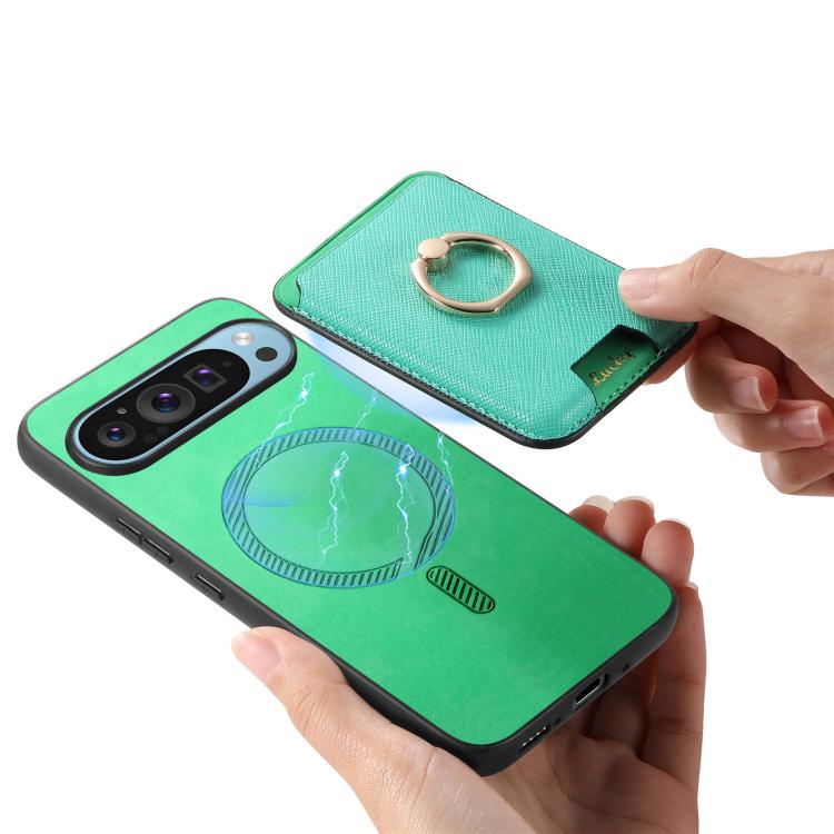 Funda para Google Pixel 9 Pro XL con Ranuras para Tarjetas y Anillo de Cuero (Verde)