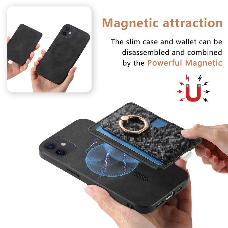 Funda para iPhone 13 Cuero Diseño Retro Cruzado Ranuras para Tarjetas Anillo (Negro)