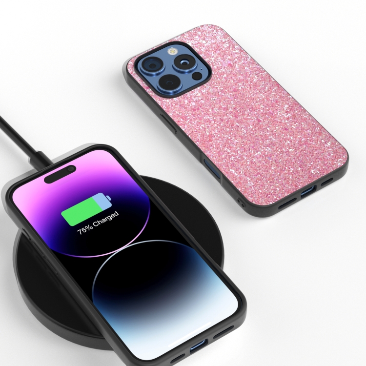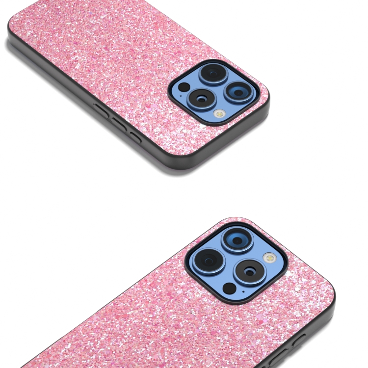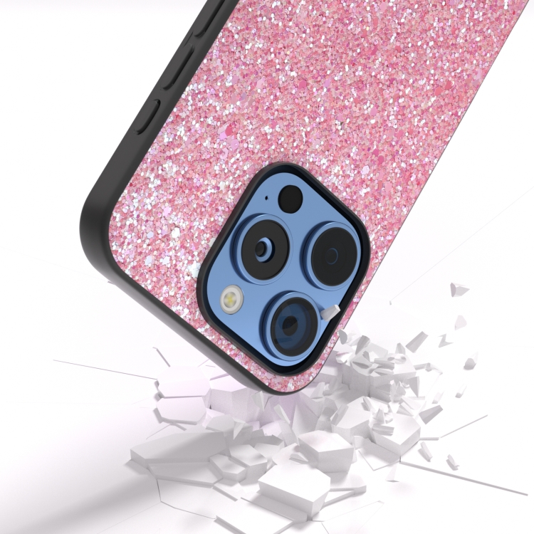 Funda para iPhone 16 Pro con Marco Negro y Purpurina de Colores (Púrpura y Rosa)
