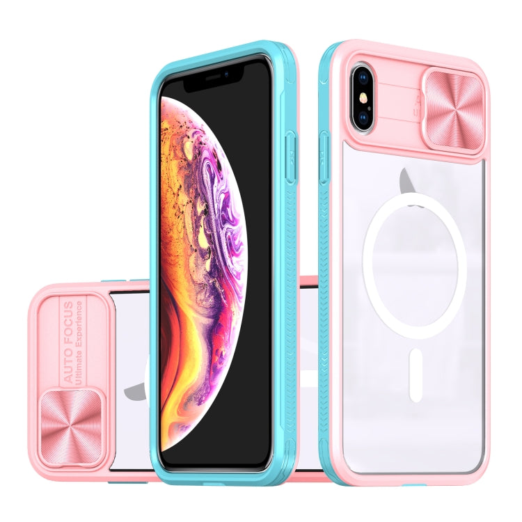 Funda para iPhone Xs Max con Cobertura Total Cubierta Deslizante Lente Magsafe Acrílico (Rosa + Cian)